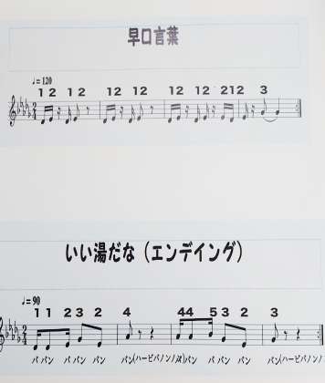 おうちにあるけんばん楽器を使って、写真1のけんばんの番号をみながら、写真2・3にのっている曲、ひいてみてください。