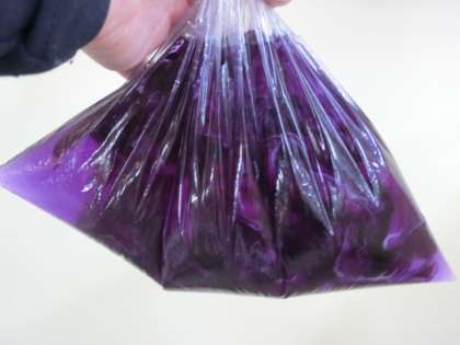 1  用意した紫キャベツを手でちぎり(2センチ四方くらい)、ちぎったキャベツをビニール袋に入れて冷凍庫で凍らせる。