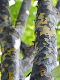 このおもしろい木肌はカリンの木。白い花が散ってガクの部分が残り、その真ん中から実がなります。季節ごとの変化を見ているとおもしろいですね。