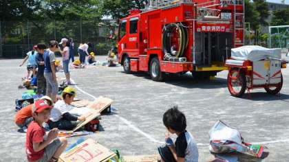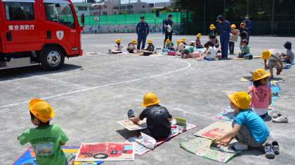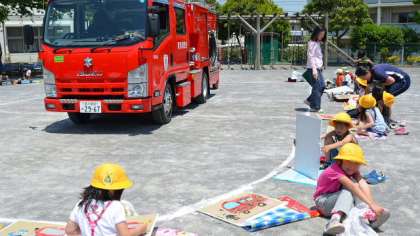 みんなそれぞれ自分の気に入った角度から消防車の絵を描きました。1・2年生の絵は大胆です。自分のとらえた印象を画用紙いっぱいに描きます。日差しが強く暑くて大変でしたが、みんな最後までがんばりました。