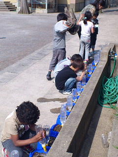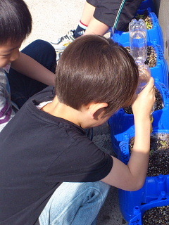 20日、1年生がアサガオのはちを見て大騒ぎ。毎日水やりした成果が出て、予想より早く発芽しました。子どもたちは大喜びです。大事そうに自分のはちを見ていました。