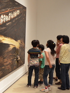 目を輝かせて作品を見ている子どもたちのようすをご覧ください。通常はもちろん美術館内の撮影は禁止ですが、子どもたちのようすと一緒に撮影するならということで、フラッシュなしで撮影する許可をいただきました。