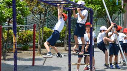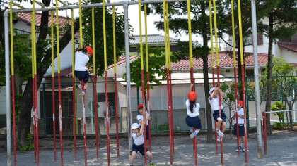 2年の体育です。準備運動の後、基本の運動としてランニング、ジャングルジムくぐり、うんてい、のぼり棒の順番にコースを設定して一人一人が取り組んでいました。よく指示を聞いてきびきびと動いていました。