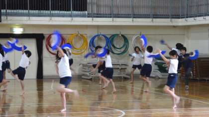 2学期の運動会に毎年5・6年生の演技種目として取り組んでいる「みかぐら」。先週までリーダーが朝練習をしていましたが、今日体育館で6年生全員の練習を行いました。6年生の動きを再確認して、5年生と合同の練習を行い、6年生が5年生の「弟子」に踊り方を教えます。