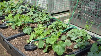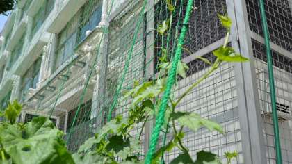 グリーンカーテンとして植えているキュウリ、ヘチマ、ゴーヤがぐんぐん伸びています。ツルがもうネットにとどいて、1mほどになっているものもあります。