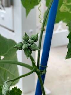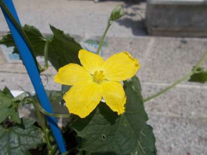 学校でうえたヘチマに花がさきました。写真はまきひげと葉、つぼみ、花の様子です。すくすくと育っています!!