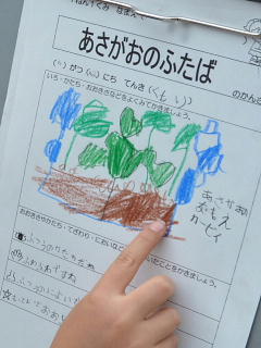 子どもたちが描いたカードを見ると、1年生なりの、新鮮なものの見方考え方が満ちあふれています。担任は一人一人のところを回って、それぞれの発見したこと、よいところを見つけ声をかけていました。中には、双葉のところに種の皮を発見した子も・・・大発見だねえとほめていました。