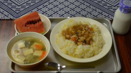 全校遠足を実施する予定だった27日。25日水曜日に延期を決定し、2日後の給食を実施できるように栄養士、調理主事が全力で取り組み、業者さんにも協力していただいて今日無事に給食を提供できました。献立は「あんかけチャーハン」「わかめスープ」「牛乳」デザートの「スイカ」です。音楽集会の時副校長からメニューを紹介したところ大喜びでした。