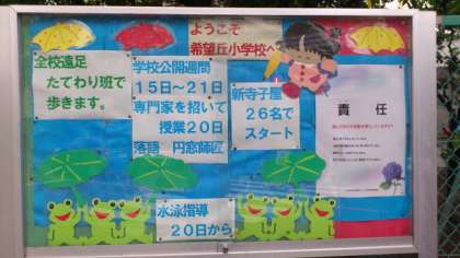 正門わきの道路に面したところにある掲示板をご覧になったことはありますか?担当は本校の副校長です。昨日模様替えをして6月バージョンになっています。絵はコピーではなく全部オリジナルです。