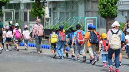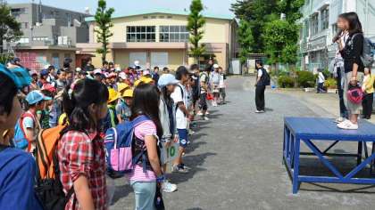 校庭に1〜6年生のグループ「希望っ子班」ごとに集合し、代表の言葉を聞いてさあ出発です。低学年と高学年がしっかり手をつないで、安全に気をつけて歩きます。