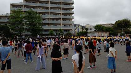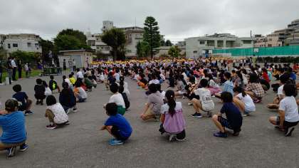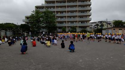 工事の囲いがとれ、少し広くなった校庭に530人ほどの児童が整列をしました。