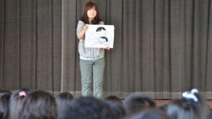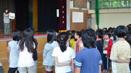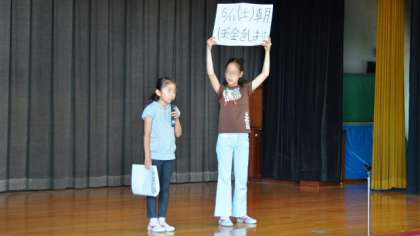 6日の朝会の内容は盛りだくさん。6月4日「虫歯予防デー」にちなんで、養護教諭から虫歯を予防するための注意点についてクイズを織り交ぜて話しました。また、最後に児童会から6月11日土曜授業日に行う、東北地方大震災への募金活動の呼びかけがありました。