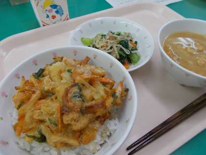 おいしいかき揚げを作るポイントは、「風味や食感の異なる素材を合わせること」と言われています。今回は、「えび、ちくわ、大豆、玉ねぎ、春菊」の組み合わせです。