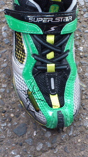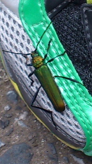朝登校してきた1年生の靴に・・・周りの子が騒いでいます。靴の緑色の部分に緑色の虫がついています。どうやらカミキリムシの一種「ミドリカミキリムシ」のようです。雑木林によくいる虫です。手にとってみせると「きれいな色だね・・」という感想。まさに玉虫のような美しい金属光沢をはなっています。「どうしてくっついたんだろうね?」「同じ色だから仲間だと思ったんじゃない?」そうかもしれませんね。そっと学校のしげみにはなしてやりました。