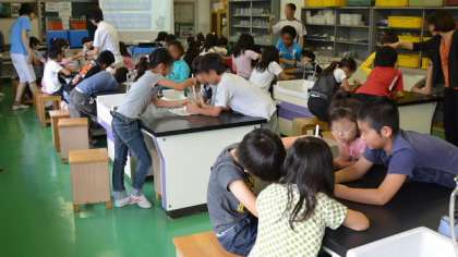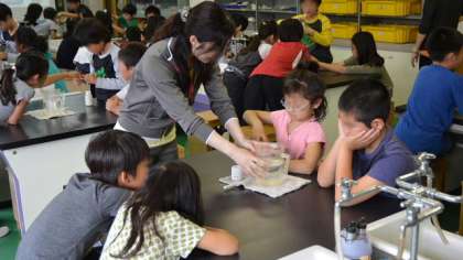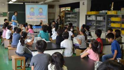 16日、学校公開2日目。都水道局主催の水道キャラバンが来校し、4年生に出前授業を行いました。前半は水道の基礎知識について、映像を使ってクイズ形式も交えわかりやすく説明してくださいました。前日に水道博物館を訪れた4年生にとっては、復習になりました。後半は水道水の浄化の過程を実験で行ってみました。水をわざと濁らせ、凝集剤を使って濁りをとります。その後、実際に浄水場で使われている濾過剤を使って濾過します。