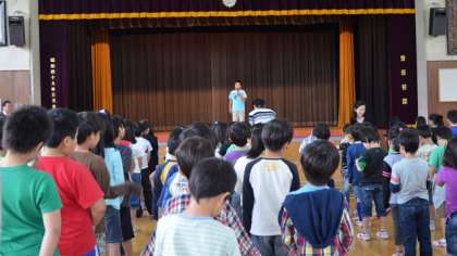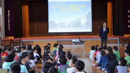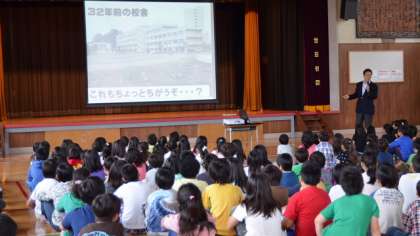 続いて学校長より、クイズの内容の解説も含めて、学校ができる前の周辺の様子や、開校当時の校舎の様子、そして児童数の移り変わりなどを写真を交えて紹介しました。その写真は、校長日記で紹介します。最後にみんなで声高らかに校歌を歌って会を閉じました。