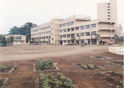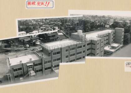 昭和49年開校当時から、校舎は大きく変わっていませんが、一部増築されています。下の写真をご覧ください。一番上の写真が建設直後の校舎(北側から撮影)、中が昭和53年の増築直前の校舎(南側校庭から撮影)です。校舎東側の半分が3階までしかありません。4階とその東側に校舎がさらに増築され、北側に階段とトイレが増築されたのです。下の写真と見比べてください。