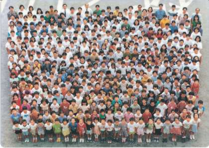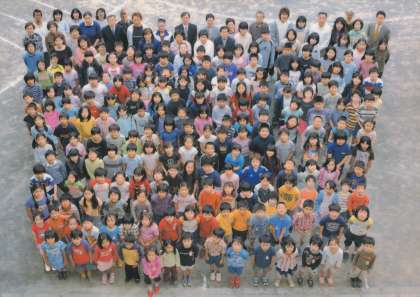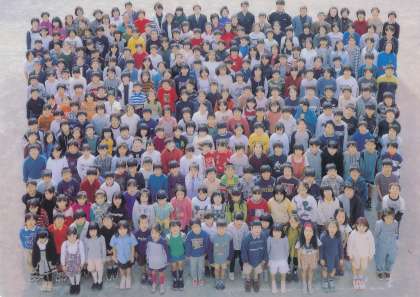 どれくらい少なくなったのか、全校児童で写した記念写真がありますのでご覧ください。一番上が平成5年20周年で377人(これでもピーク時の半分以下)。中が平成10年25周年で262人。そして下が平成15年30周年で185人(今とほぼ同じ)です。あと2年で開校40周年の節目を迎えます。それまでに、少しでも児童数が増えることを期待しています。
