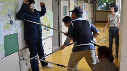 17日、不審者対応訓練を行いました。無断侵入した不審者に扮した主事が3年生の教室に。担任が対応している最中に児童は隣のクラスへ。隣の担任から職員室へ通報を行い、職員が教室に駆けつけて協力し不審者を押さえ込む。児童は念のため体育館に一時避難。という手順で行いました。地震対策も大事ですが、このようなケースも想定して、真剣な訓練を怠らないよう努力しています。