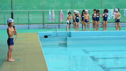 20日3・4時間目は、1・2年生のプール開きです。小学校では初めて水泳指導を行う1年生は基本が大切。セレモニーの後はバディの確認や準備体操を念入りに行いました。