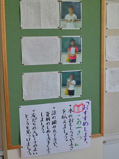 読書への取り組みは各学級で行われています。左の写真は読書の結果を「読書カードに記入しているようす。中は自分の読んだ本を朝のスピーチで紹介しているところ。右は、おすすめの本をカードにまとめ紹介している掲示物です。