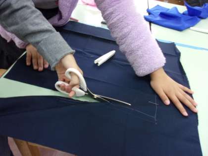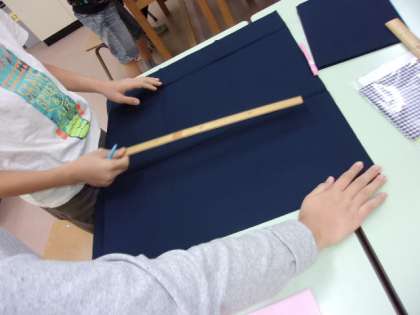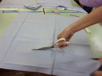 ミシンの取り扱いの学習が終わり、いよいよクッション製作が始まりました。クッション製作の計画も立て、あとは作るだけです。まずは、自分の布を裁つところから!