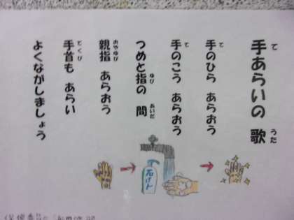 希望小のみなさん、心の中で歌いながら正しい手洗いの仕方を覚えていきましょう。