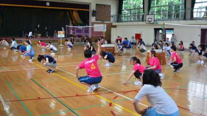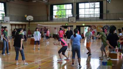 毎年恒例のPTA全校親睦会、ソフトバレーボール大会が25日土曜日午後、体育館で行われました。先日までの真夏のような天気から、ちょどこの日は曇りになって暑さがゆるみ絶好のコンディションとなりました。最初に校長、PTA会長の話で開会式を行い、準備体操、チームごとの練習とプログラムが進み、いよいよ6人一チームで学年対抗のリーグ戦が始まりました。