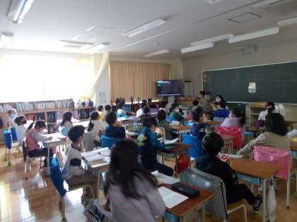 今朝は体育委員会の皆さんが、ボールの使い方や片付け方、校庭にラインを引く石石灰の扱い方などについて教えてくれました。休み時間や体育の場面が再現されていたりクイズが盛りこまれていたりして、とても楽しく分かりやすい内容になっていました。