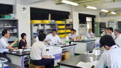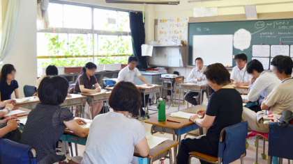 授業の後、家庭科室に5校の100人に近い教員が集まり、全体研究会を行い、その後、授業の分科会に分かれて意見交換をしました。来年度から船橋中学校と希望丘中学校が統合され新校ができますが、これを契機に、小中学校9年間の義務教育を連携して進めていくことができればと考えています。