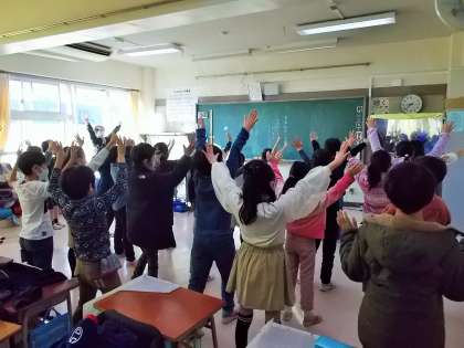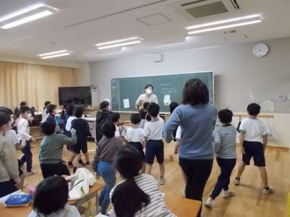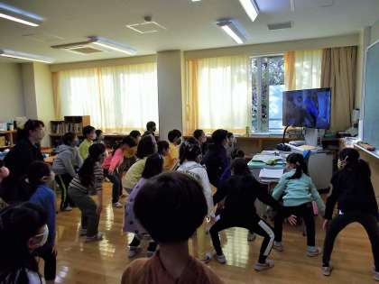 昨年結成した「レイン望きっず2020」のメンバーだった56年生のお手本を見ながら、どの学年もたのしく踊っていました。