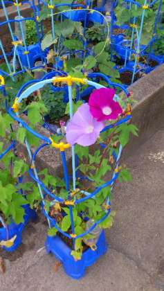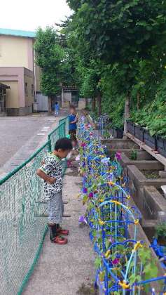 1年生が大事に育てているアサガオが、暑さに負けず毎日花をつけています。毎朝忘れずに水やりをしている1年生は立派です。