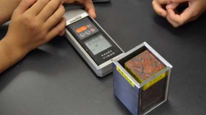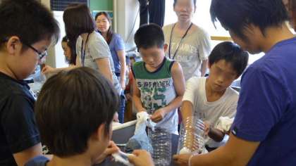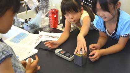 放射線に関する感心が高まっていますが、正しい知識を身につけて落ち着いて行動できるようにしてほしいという願いをもって、この実験を導入しました。コンクリートの建物の中では、放射線量は若干高めに出るのですが、この日の理科室ではおおむね0.05マイクロシーベルト/時くらいの測定結果でした。(簡易型の放射線量計ですので、確かな数値とはいえない場合があります)。後半は、大震災が東京で起こった場合に備えてということで、身の回りにある物で簡単に作れる防災グッズを作ってみました。初めに、ペットボトルと炭、綿で作る浄水器を作って泥水を濾過してみました。実験では完全には濾過できませんでしたが、使う素材をさらに工夫すれば、もっときれいにできると思います。