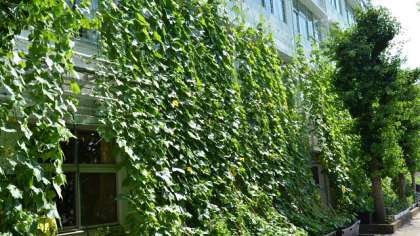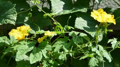 グリーンカーテンの先端が2階を超えて3階にとどいています。暑い日が続いて、キュウリは毎日のように収穫できています。ヘチマの花もこのところ次々と咲いて、ゴーヤの花ももう少しで咲きそうです。夏休みまであと10日程度ですが、グリーンカーテンはどこまでのびるでしょうか。