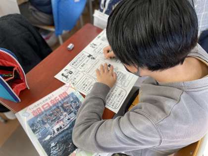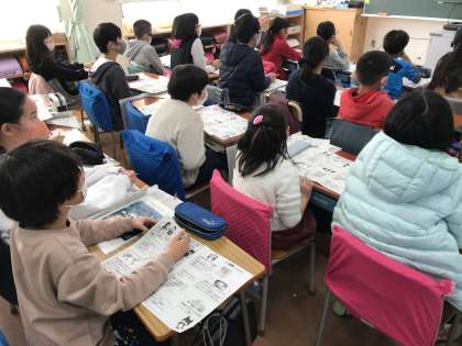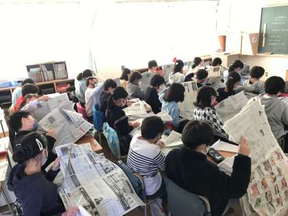 3日(水)朝日新聞社とのオンライン社会科見学がありました。第1部では、新聞ができるまで・新聞の読み方などを教えていただきました。第2部では、実際に今朝の新聞を1人1部使用して気になる見出しを9つ探し、ビンゴ形式でゲームを行いました。自分がその見出しを選んだ理由を言ったり、友達がどんな見出しを選んだのかを注意深く聞いたりと楽しんで活動することができました。2時間の社会科見学を終え、もっと新聞に親しもうとする様子が子どもたちから見られました。