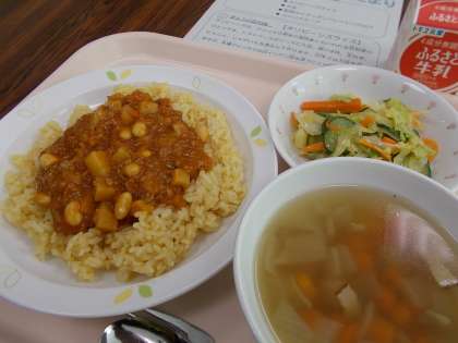 チリビーンズは、アメリカや南米の国民食とも言われる豆料理のひとつです。トマトベースのソースに大豆、豚ひき肉、玉ねぎ、にんじん、じゃがいもを煮込んで作ります。日本では大豆を使いますが、本場アメリカでは白インゲン豆を使うことが多いそうです。これをカレー粉で炊いたご飯にかけていただきます。