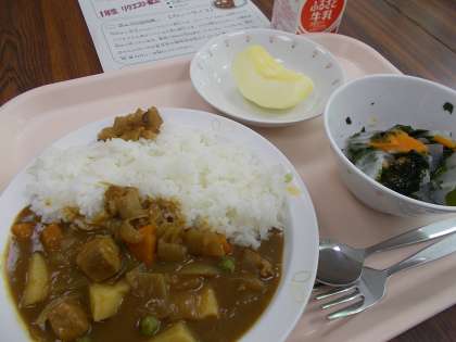 今日は1年生からのリクエスト献立です。カレーライスはどの学年からもリクエストに上がってくる人気の献立です。ルウはバターを溶かし、小麦粉を炒めるところから作っています。飴色に炒めた玉ねぎやじゃがいも、にんじん、豚肉。そしていろいろな香辛料や調味料を加えてコトコト煮込んで作りました。給食のカレーを味わってもらいました。