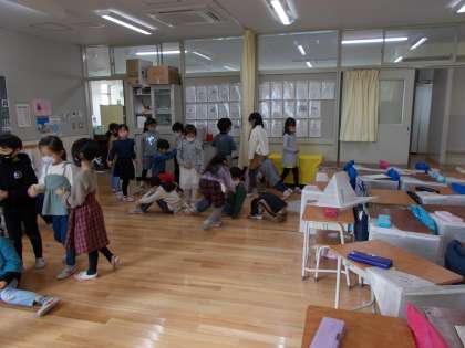 教科「日本語」の「いろいろになりきってみよう」の学習で、4〜5人の班のお友達と一緒に、自転車になりきりました。タイヤの役になる子、自転車に乗る子など、役割を考えたり担当を決めたりして、楽しく演じました。