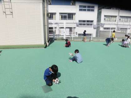 紙コップで風車を作った後、転がるタイプの風車を作りました。紙皿の中心を切り開いてから、互い違いに折ったものを2つ作りました。その2つをホッチキスでくっつけました。屋上で、風が吹くと転がるのを見て、子ども達は喜んでいました。