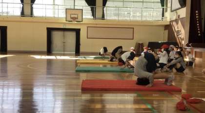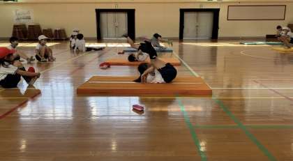 4年生は、体育「マット運動」で発表会を行いました。「前転」「開脚前転」「後転」「開脚後転」「側方倒立回転」などの技を組み合わせて発表会に挑みました。できるようになった技を見てもらい、友達からの拍手ももらって嬉しそうでした。