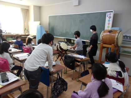 日本の音楽に親しむ学習として、和太鼓に挑戦しました。構えの姿勢やバチの持ち方などを確認しながら、8拍のリズムを一人一人叩きました。力加減は難しかったですが、和楽器の良さや響きを楽しみました。