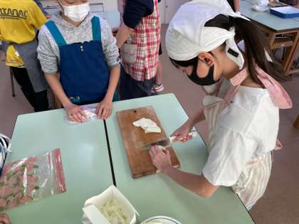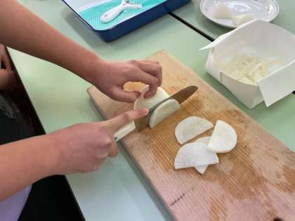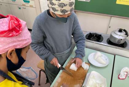 家庭科では、調理の仕方を学習しています。この日は包丁の使い方をたしかめました。「そえる手はネコの手だよ。」「きき足を一歩後ろに下げて切るよ。」とポイントをたしかめながら、丁寧にいちょう切りや半月切りに挑戦しました。