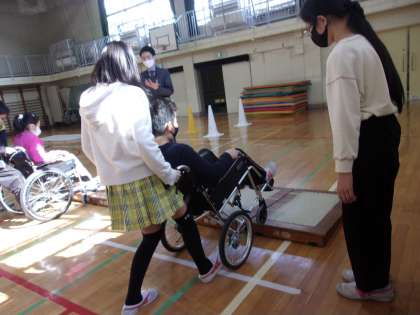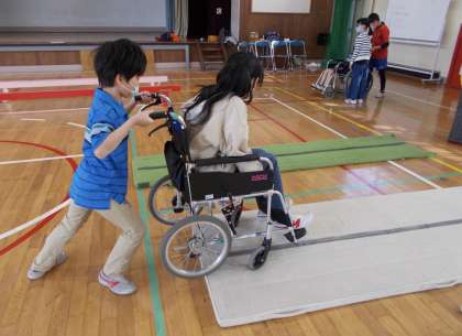 社会福祉法人世田谷区社会福祉協議会の方々をお招きして、車椅子体験の学習を行いました。座面の開き方を教えていただき、実際に車椅子に乗ってみました。坂道の上り下りでは、自分が乗っている時のことを想定しながら押したり、相手のことを考えながら押したりすることができました。