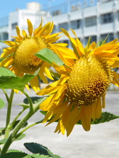 学校敷地内の植物も夏真っ盛り。ヒマワリは一斉に花を開き、夏休み前に真夏の雰囲気を醸し出しています。果樹の実もぐんぐん大きくなり始めています。カリンと柿の実のようすです。