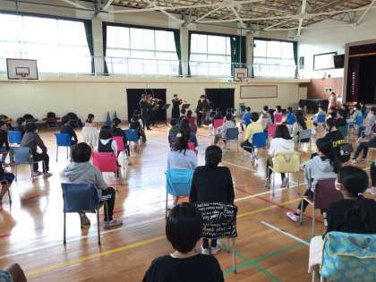 本物の弦楽器をもったプロの演奏家が登場し、チューニングが始まった途端、普段使っている体育館が、コンサートホールに大変身!この日は、授業で学習した「アイネ・クライネ・ナハトムジーク」をはじめ、クラシックの名曲を3曲鑑賞しました。曲のよさ、楽器の音色、4つの楽器がつくり出す響きの豊かさ、5人が息を合わせて演奏している様子など、児童は目と耳をじーっと傾けて、味わっていました。さらに、本校校歌の弦楽五重奏バージョンの披露(さらに楽譜とCDもいただきました!)という、嬉しいプレゼントをいただきました。
