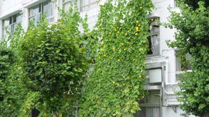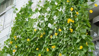 3階までとどいているグリーンカーテンが、20日台風の影響の南風で揺れています。今日の段階ではヘチマが伸びていて、花盛りです。これ以上風が強くなると飛ばされてしまわないか心配です。