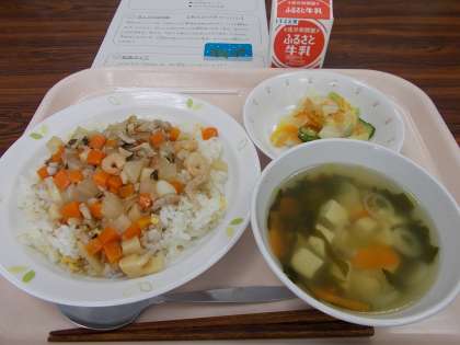今日のチャーハンは、ごはんにいり卵を混ぜ合わせたチャーハンに豚肉やえび、にんじん、大根などいろいろな具材を入れた”あん”をかけていただきます。”あん”は澱粉ででとろみをつけています。とろみの効果で冷めにくく、口当たりを良くしています。みんな喜んで食べてくれました。