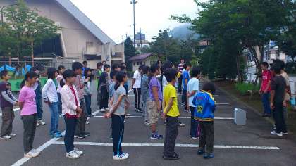 6時30分から、近所の駐車場で朝会。元気なあいさつでスタート。ちょっと眠そうなようすです。全員健康状態良好です。