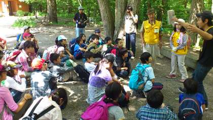 湯滝の駐車場で一休みした後、ガイドさんの説明を聞いてガイドウォーク出発準備。