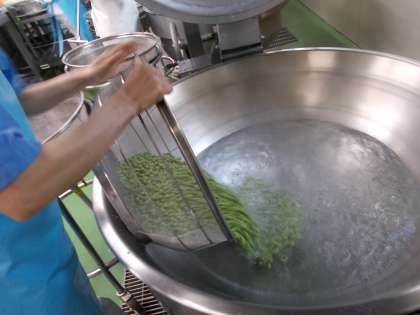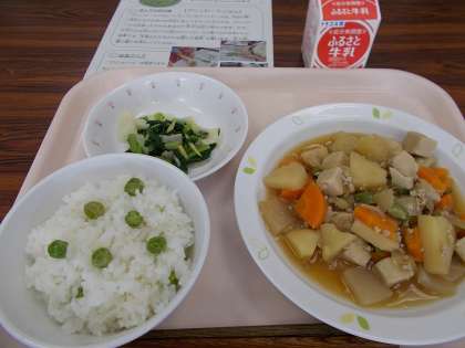 「グリンピースごはん」に入っているグリンピースは、今日の朝、1年生にさや剥きのお手伝いをしてもらったものです。グリンピースは冷凍したものもあるので一年中お店で見かけます。ただ、4月から6月にかけては生のグリンピースが食べられる、おいしい時期です。冷凍されたものとは香りも食感も違います。旬の味と春の香りを楽しんでください。